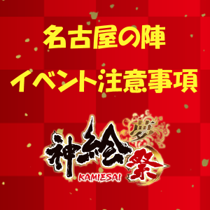 神絵祭-夢-名古屋の陣 がいよいよ今週12/20日(金)から開催です!! 今回初めて神絵祭に参加されるお客様、夏の陣に引き続き楽しみにお待ちいただいた神絵祭ファンの方々、神絵祭開催にあたり皆様にお願いがございます。会期中は多数のご来場が予想されますので、下記注意事項をお守りいただき楽しい神絵祭をお過ごしください。 【名古屋の陣 特...