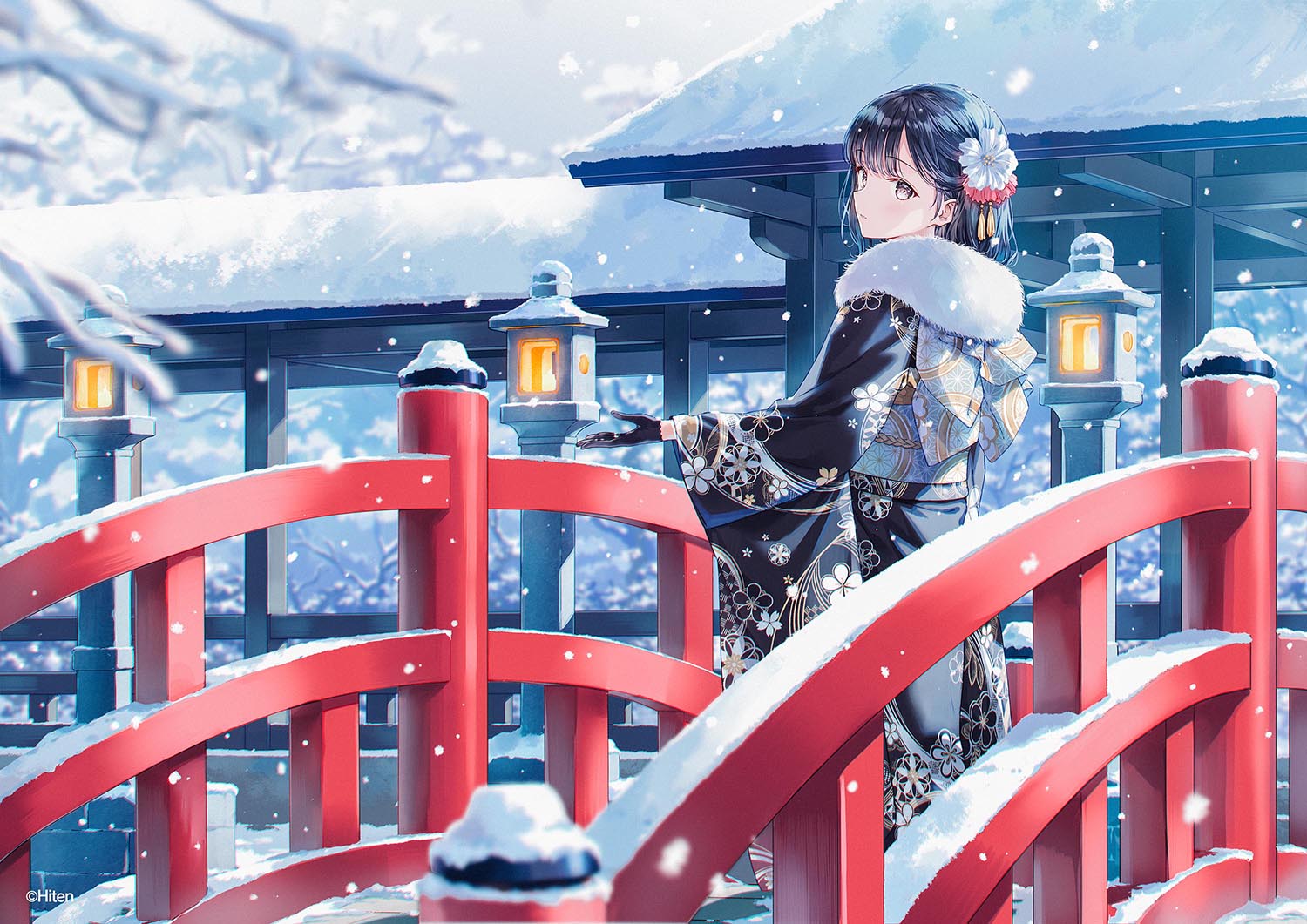 黒い着物と赤い輪橋、白い雪のコントラストが映えるように色のバランスを工夫しました。