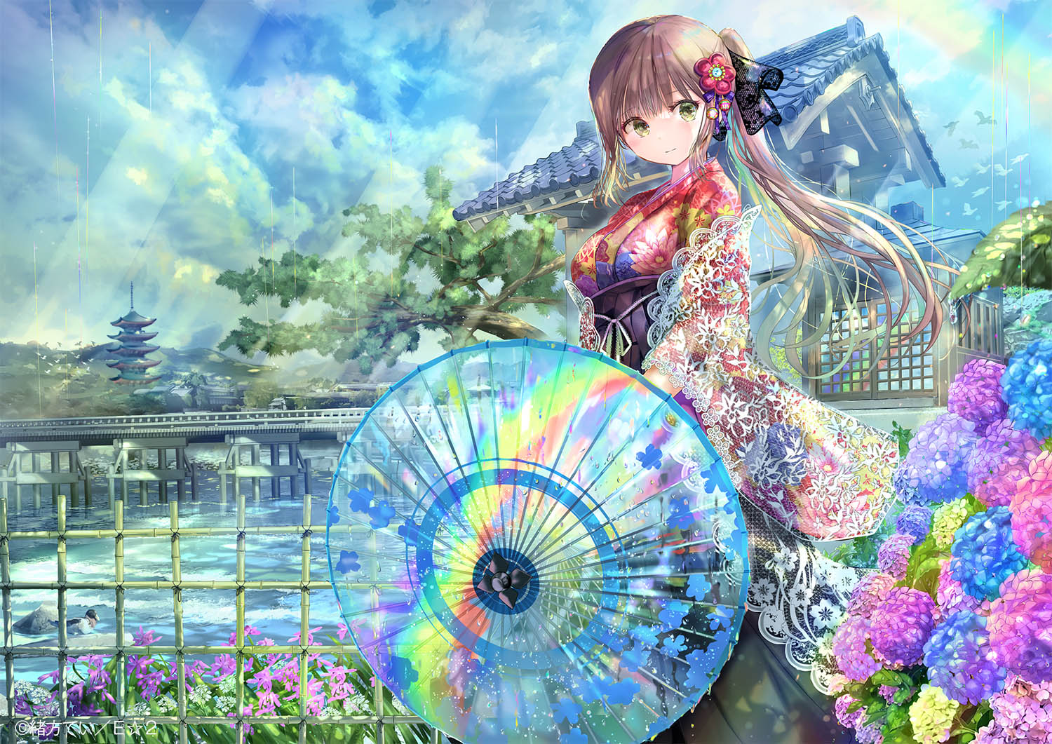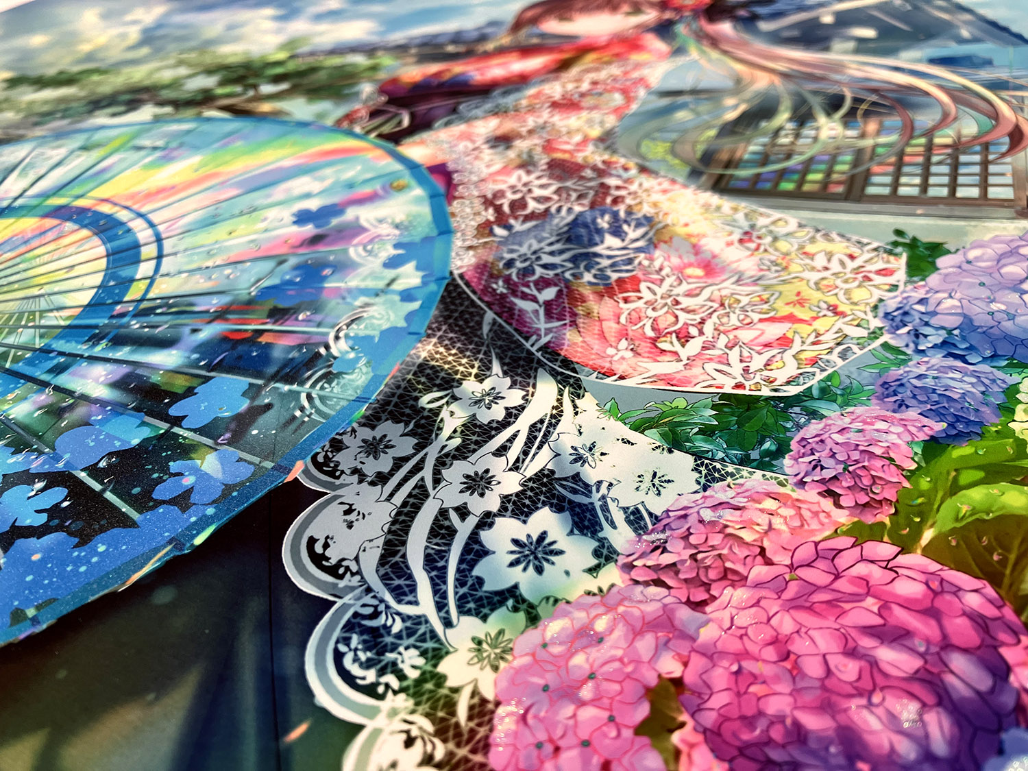 見所は、和傘風ビニール傘に映る虹や川や橋、遠くの街並みに当たる日差し、